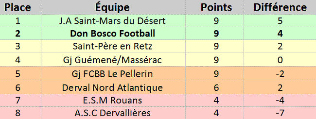 Après une causerie relatant les quelques erreurs mais appuyant sur le plaisir du jeu proposé, les huit acteurs "jaunes et verts" repartirent avec la faim d'accrocher le cadre. Les deux équipes firent jeu égale dans cette deuxième période où les attaquants n'ont pas cessé de se répondre mais c'est finalement les locaux qui ouvrirent le score puis l'alourdirent rapidement. Un coup de massue derrière la tête de nos joueurs qui virent le score tourné en leur défaveur malgré le jeu proposé. Les dix dernières minutes étaient en notre faveur, l'équipe locale prit son temps, en gagna par moment pour éviter que les visiteurs puissent croire en une égalisation. A la dernière minute, alors que la défaite était malheureusement jouée, un corner en faveur de Don Bosco fut sifflé. Anthony Glotain, insoufla un vent de motivation à ses joueurs pour réduire le score car selon ses propres termes, "ils le méritaient".